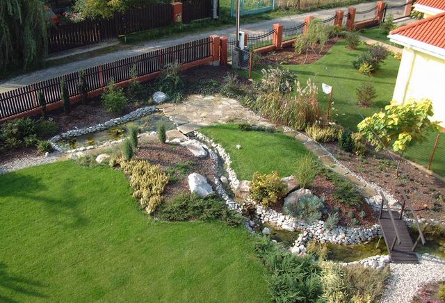 Oczko640x436Rzut oka na oczka wodne połączone "strumyczkiem".Nad rzeczką przerzucony jest mostek, który przechodziw meandrującą ścieżkę.