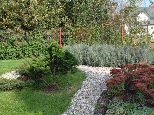 Cyprys i lawendy640x480Na tle szarych lawend pięknie odcina się intensywna zieleńniewielkiego cyprysa. Dla kontrastu z prawej mamy rozchodniki okazałe.